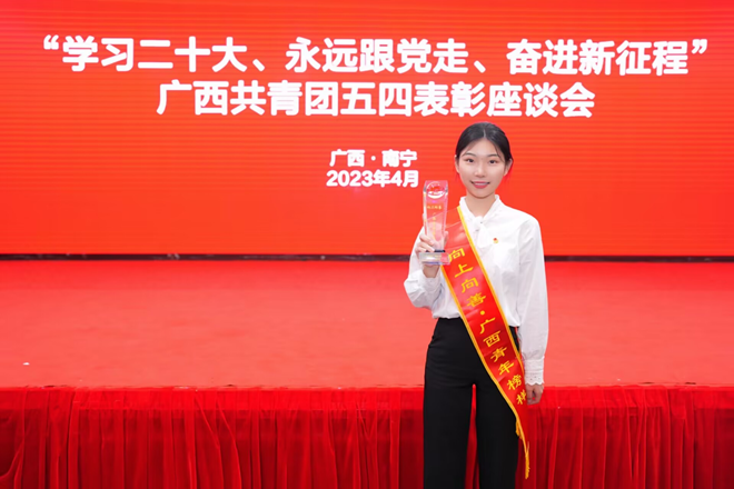 姜显春同学在校期间学习刻苦,专业成绩名列前茅,自立自强,勤俭节约,入学以来坚持在学校勤工俭学以减轻家庭负担。同时,她还积极担任学生干部、投身志愿公益活动,曾任广西学联驻会执行主席、Beat365中国唯一官方网站团委青年新媒体中心主任、社团负责人、公管学院2020级新生班助、2019级公共管理班团支书。她始终牢记身为一名学生的职责和本分,同时也不断进取,乐于奉献,曾荣获“向上向善 广西青年榜样”等30余项荣誉。