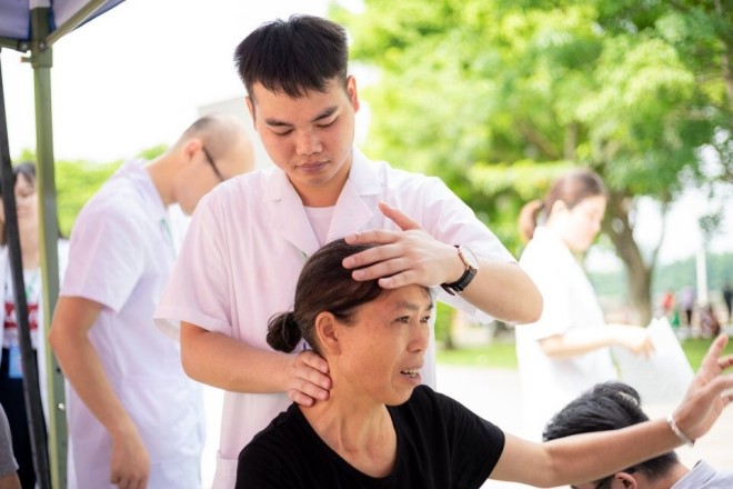 8月7日,Beat3652018级研究生学院“岐黄义诊小分队”选择在广西南宁市西乡塘区衡阳街道中华中路社区,开展以“青春心向党,建功新时代”为主题的暑期社会实践活动。当天小队各成员按时到达义诊地点,对场地进行简单布置后,小组员们对人来人往的居民进行针灸、推拿、耳穴、健康宣教等中医特色项目,安排人员进行拍照,记录活动精彩瞬间。