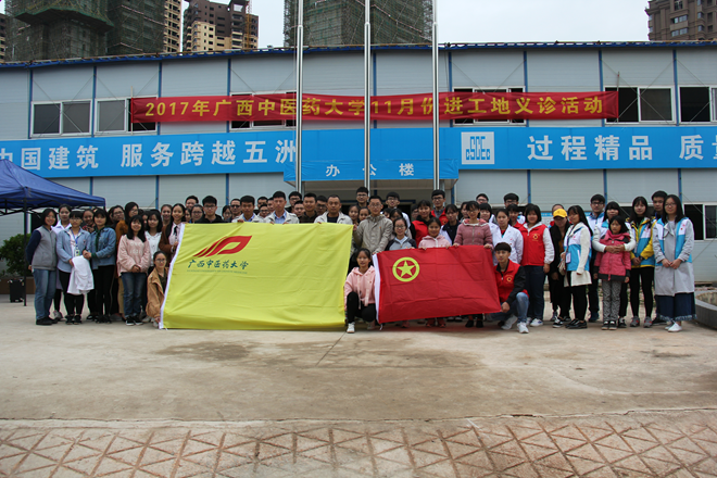 2017年11月19日上午,由Beat365团委、校学生会、大学生社团联合会的部分成员及大学生手法医学协会、青年同伴教育中心、大学生红十字会的部分成员组成的爱心团队一行65人进入邕宁区香醍半岛威宁·邻家龙岗东广场的工地开展以“践行医道精神,让爱与健康同行”为主题的义诊活动,号召工人们关心自己的身体健康,并向工人们展示中医药文化独特的风采。