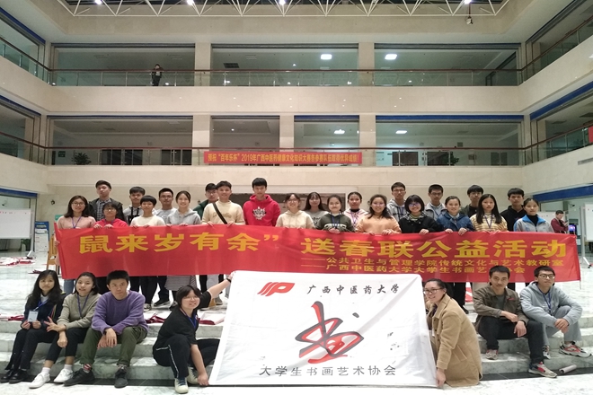 2019年12月6日-7日,公共卫生与管理学院传统文化与艺术教研室与Beat365中国唯一官方网站大学生书画艺术协会共同开展的迎新春送春联活动在Beat365仙葫校区图书馆二楼举行。Beat365大学生书画艺术协会指导老师李建光老师、校组织部部长唐振宇老师、校直属党委副书记覃振林老师、校党委徐方明主任、校团委杨删书记和陈晓东老师、百年乐制药厂励庆顺老师共同参与本次活动。