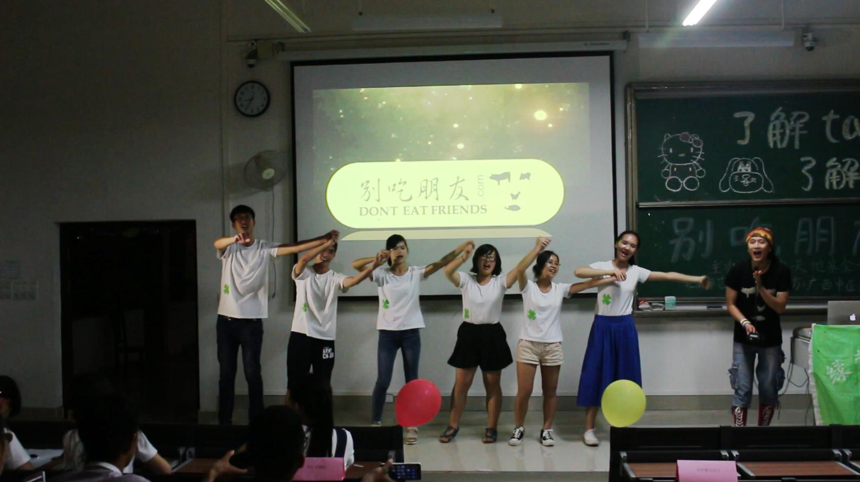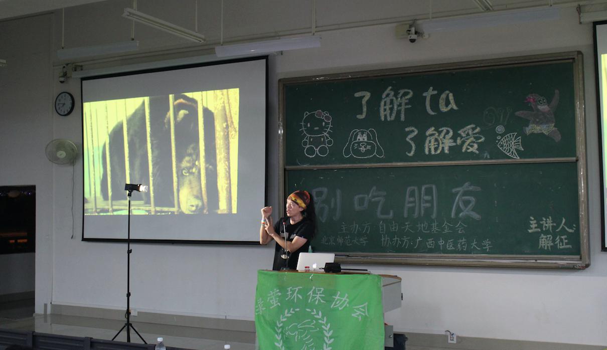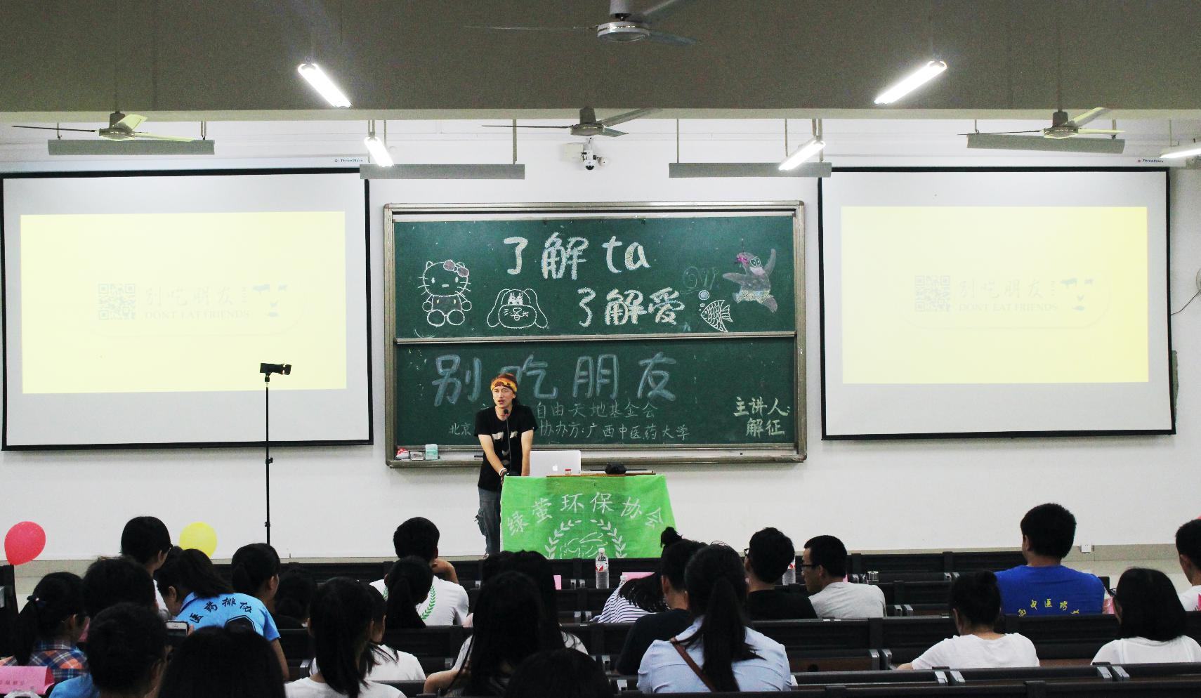 为了让同学们了解一些动物的生存现状、增强保护动物的意识,2016年5月5日晚19点,以“了解ta,了解爱”为主题的唱讲会在教学楼1-101举行。主讲人是“别吃朋友”团队创始人、优质大豆乐队主唱解征。
