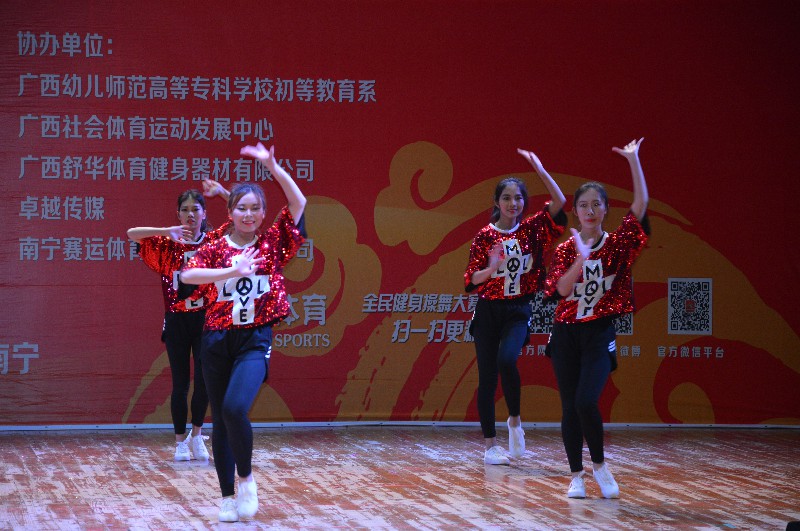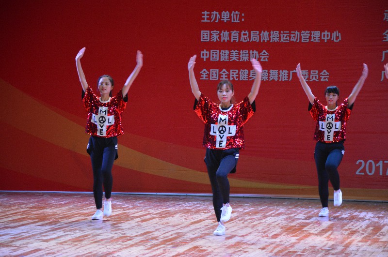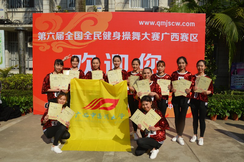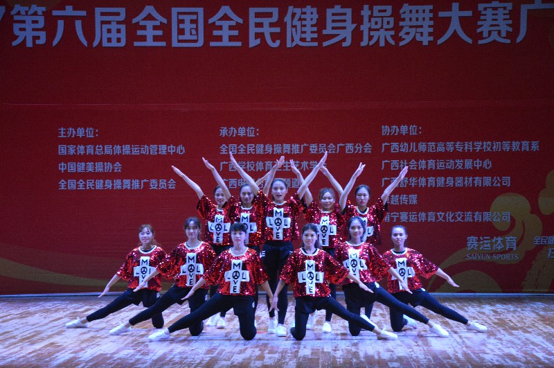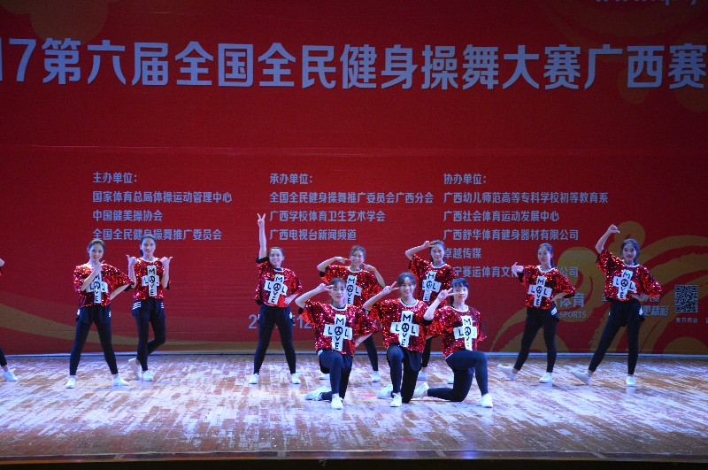 “2017第六届全国全民健身操舞大赛广西赛区”于2017年12月16-17日在广西南宁隆重举行。本次大赛由国家体育总局体操运动管理中心、中国健美操协会、全国全民健身操舞推广委员会主办,全国全民健身舞推广委员会广西分会承办,比赛历时两天,共有88个参赛单位2500余人次参赛。Beat365体育部主任李荣源为领队,唐莹老师为主教练,王佳佳、曾雨涵等11位选手参加本次比赛。
