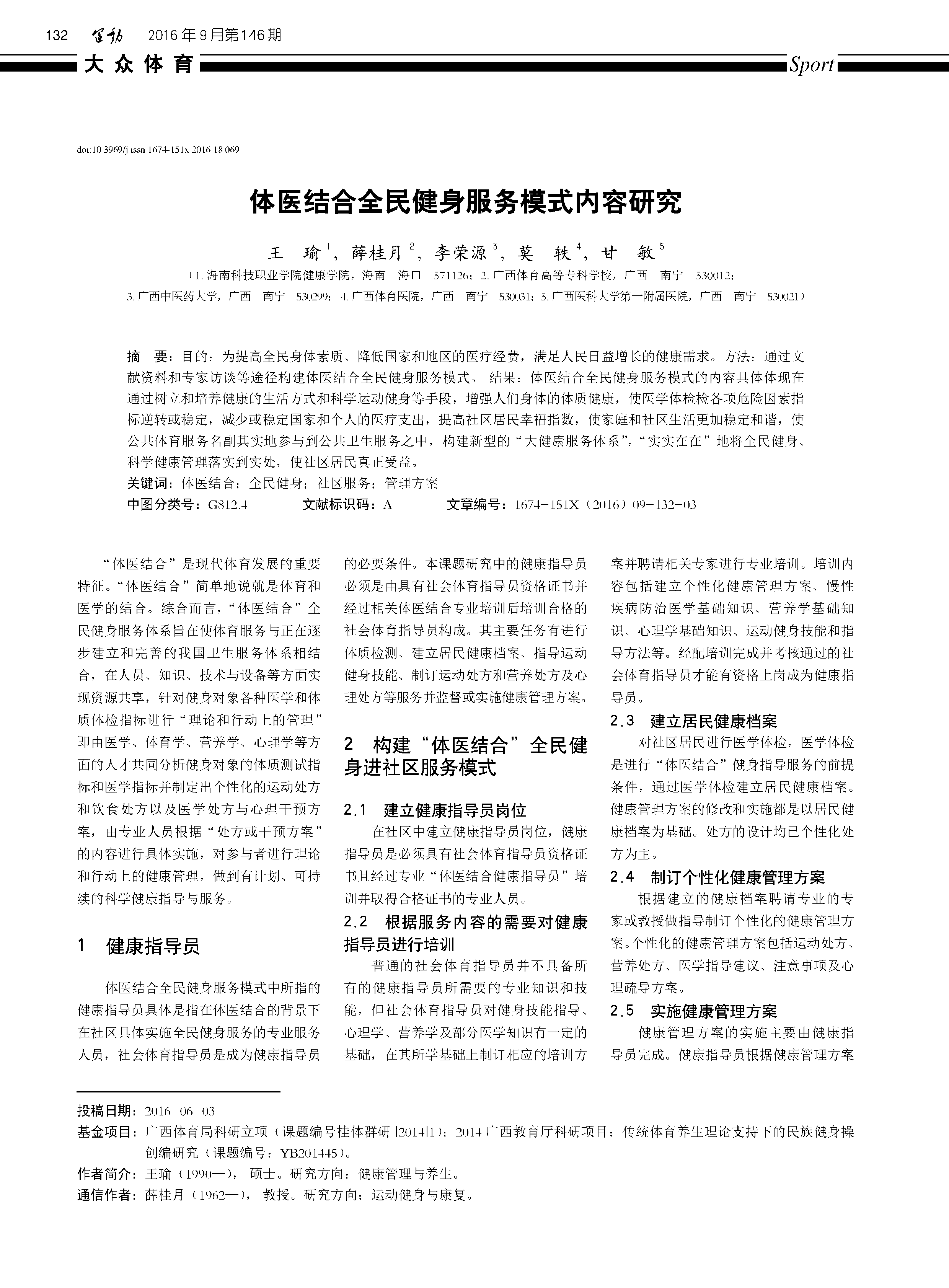 李荣源老师以第三作者发表《体医结合全民健身服务模式内容研究》