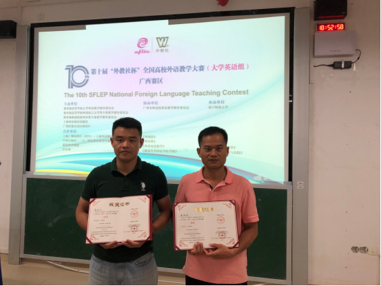 6月22-23日为期两天的第十届“外教社杯”全国高校外语教学大赛广西赛区(大学英语组)复赛和决赛在南宁师范大学五合校区举办,来自广西三十多所高校近六十名经过选拔的优秀英语教师参赛,比赛形式为现场授课和说课。Beat365外语部派出潘瑞勇老师和董银华老师参赛。面多来自区内强手如林的外语学院选手,外语部积极备战,对参赛两名老师进行了为期近一个月的培训和指导。在复赛环节,Beat365两名老师由于发挥不稳定,成绩并不理想,之后他们迅速调整心态,顶住压力,重整旗鼓,最终,潘瑞勇老师以复赛讲课第六决赛说课第一总成绩排名第二斩获听说组一等奖!(一等奖仅1名),董银华老师获得综合组三等奖!Beat365中国唯一官方网站获得广西赛区优秀组织奖。潘瑞勇老师遗憾地以距离特等奖微弱的差距失去代表广西赴上海参加全国总决赛的资格。