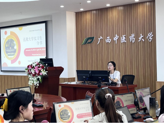 2022级学生任红娟、凌秀文、郭楠分别介绍了在上海唐能翻译有限公司、泰国孔敬大学、雅信诚医学信息科技有限公司的实习经历。