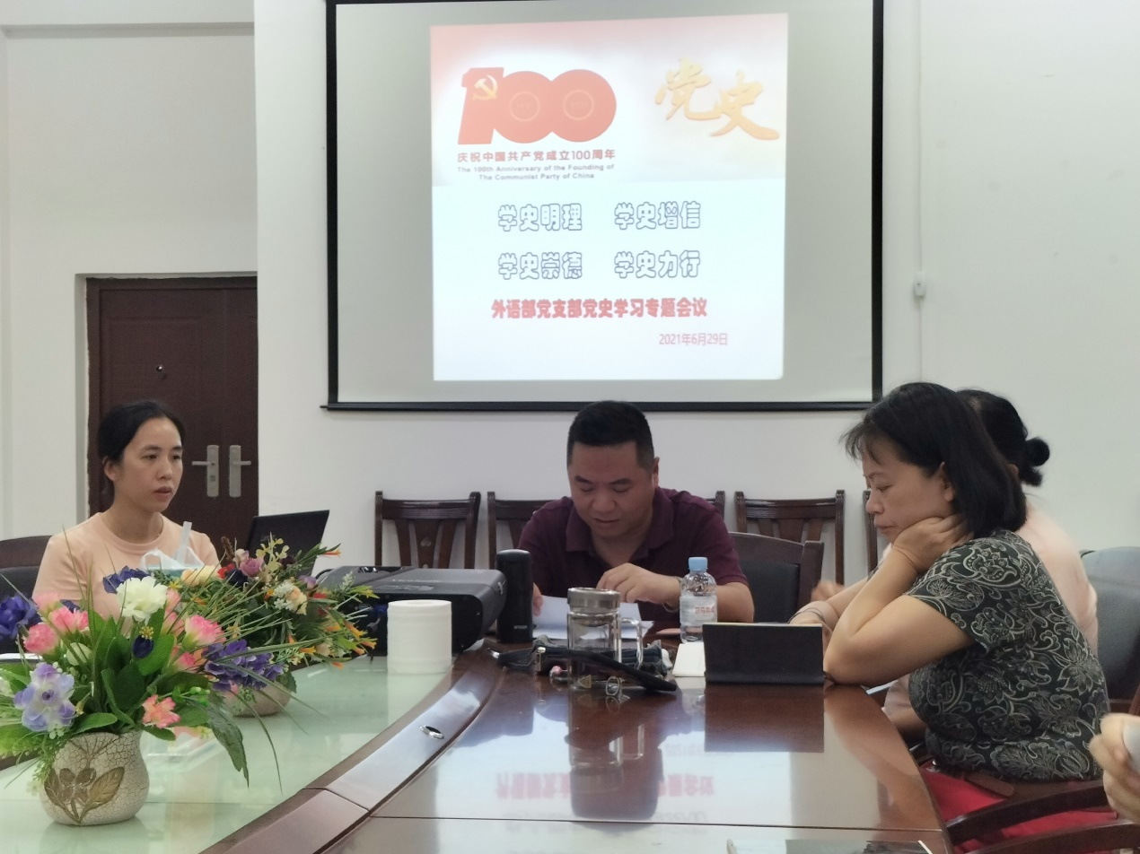 为全面深入推进党史学习教育,引导外语部教师知史爱党、知史爱国,进一步坚定信仰信念、传承红色基因、强化使命担当,做到学史明理、学史增信、学史崇德、学史力行,Beat365中国唯一官方网站外语部党支部采取主题发言和分组讨论、个人发言等方式,拓宽学习渠道,使教师党员做到以党史照亮前行之路、以党史洗涤心灵之尘、以党史激发奋进力量。