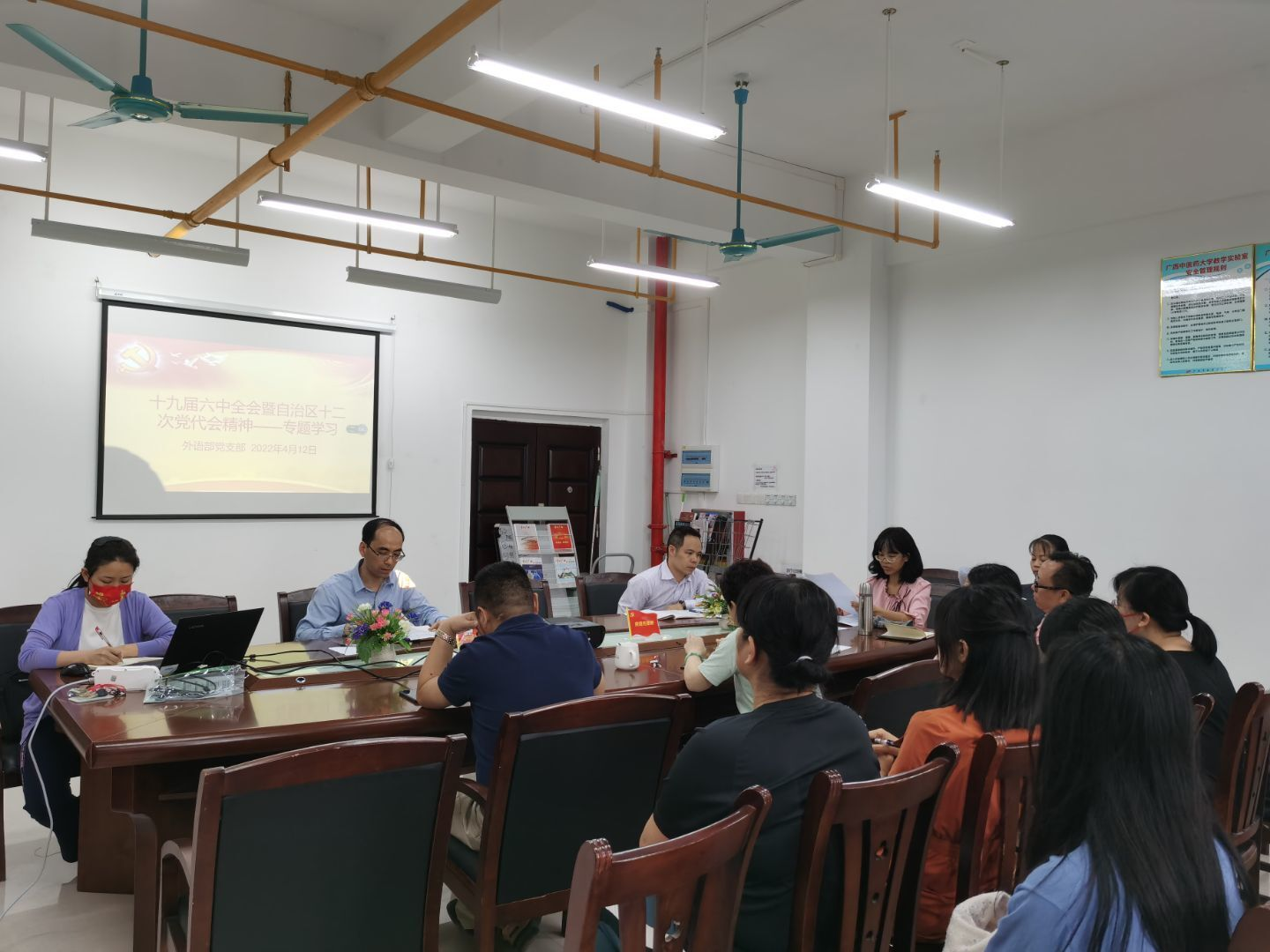 4月12日,外语部党支部在仙葫校区自诚楼A713召开全体党员大会暨学习党的十九届六中全会精神和自治区第十二次党代会精神、党风廉政建设主题党日活动。