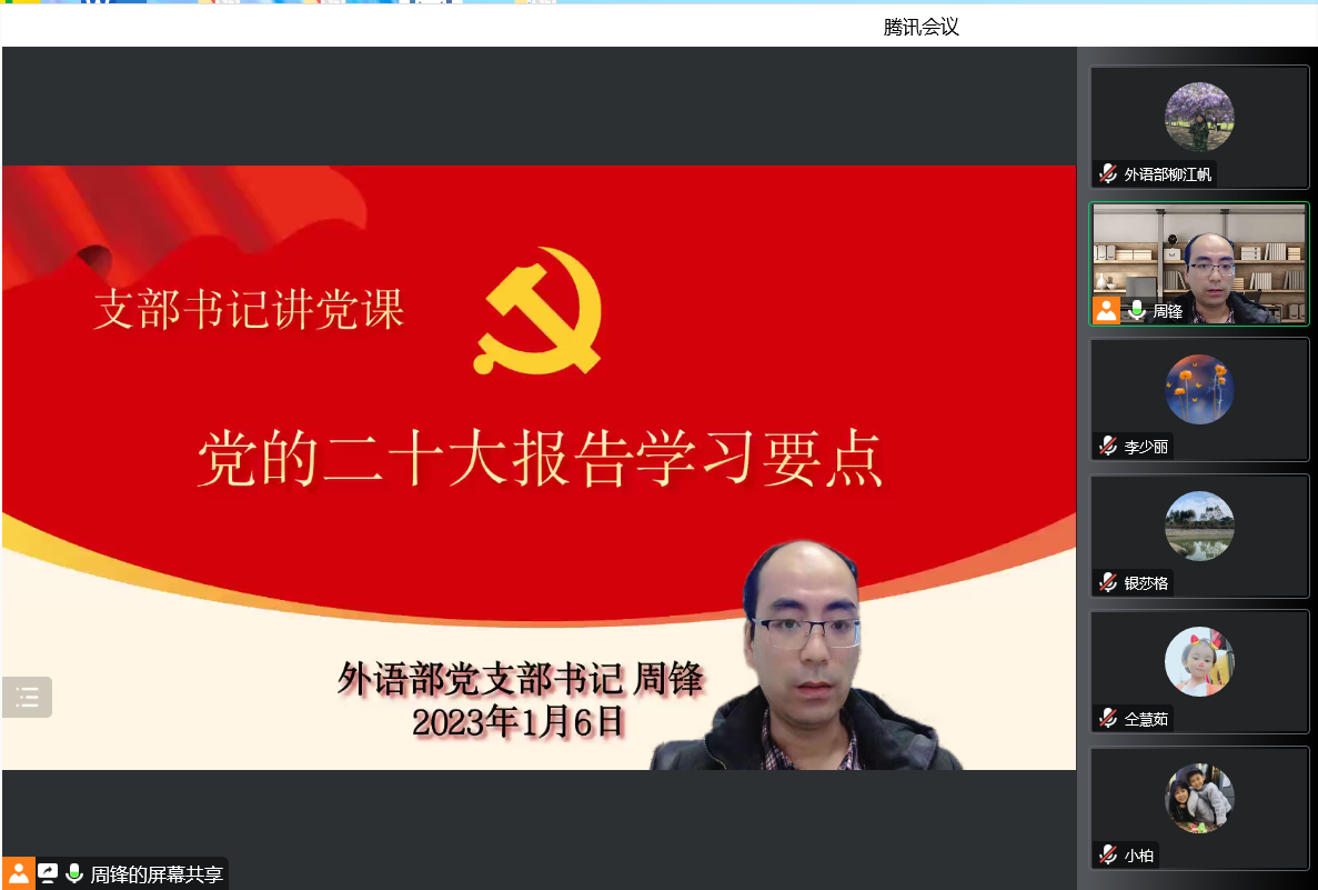 为了进一步深入学习贯彻党的二十大精神,1月6日上午,外语部党支部线上开展学习贯彻党的二十大精神专题党课活动。党课由外语部党支部书记周锋主讲,外语部全体党员教师参加。