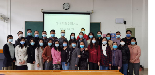 春雨绵绵的4月末,在结束7周线上教学工作后,为做好学生返校教学的各项准备工作, 2020年4月24日早上,外语部全体教师在仙葫校区教学楼1-404举行2019-2020学年第二学期新学期大会。