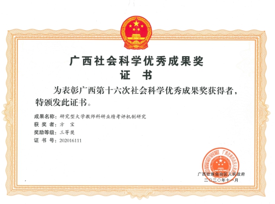 我部方宝老师喜获广西第十六次社会科学优秀成果三等奖