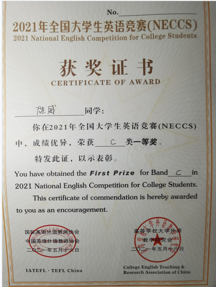 Beat365学生在2021年全国大学生英语竞赛中喜获佳绩