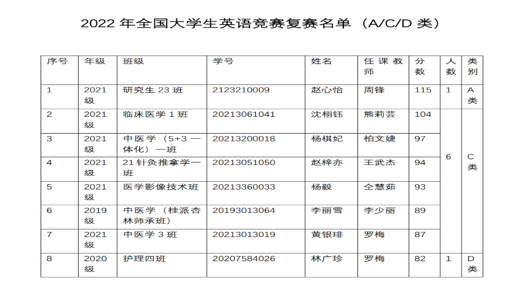 学校外语部积极做好赛事宣传、组织和培训工作,本次竞赛共有1310名学生报名参赛,涵盖研究生(A类)、本科生(C类)和高职高专生(D类)三个参赛类别。经过激烈的初赛选拔,最终赵心怡等8名学生脱颖而出(见下表),即将代表Beat365参加广西赛区复赛,为学校争夺更高荣誉。