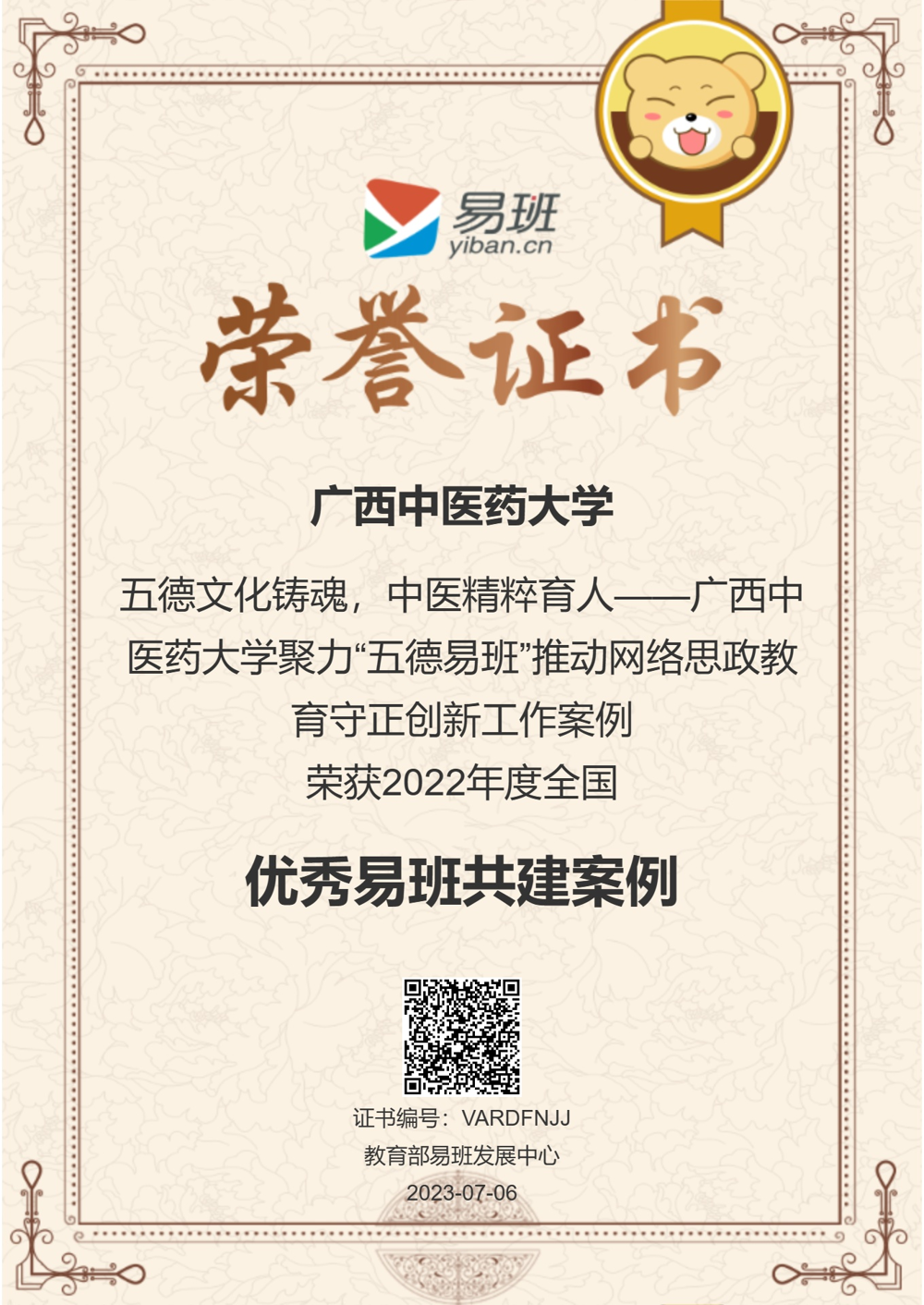 为了表彰2022年度在易班建设方面表现突出的高校、案例、指导教师、辅导员和工作站站长,各省举办了省级易班“十佳”(优秀工作案例)评选活动。教育部易班发展中心共收到了全国25个省区市及新疆生产建设兵团推荐的近900个优秀工作案例。经过专家对各省推荐材料的筛选以及综合考量2022年全年高校易班双指数及活动参与情况,最终选定了235所高校的422项工作案例,分别列入五大类全国易班共建优秀名单。Beat365被评为“优秀易班共建高校”,同时“五德文化铸魂,中医精粹育人——Beat365中国唯一官方网站聚力‘五德易班’推动网络思政教育守正创新工作案例”荣获“2022年度优秀易班共建案例”。