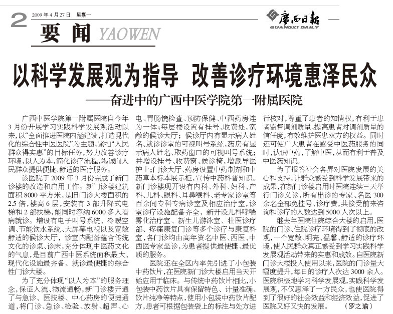 《广西日报》: 以科学发展观为指导 改善诊疗环境惠及民众
