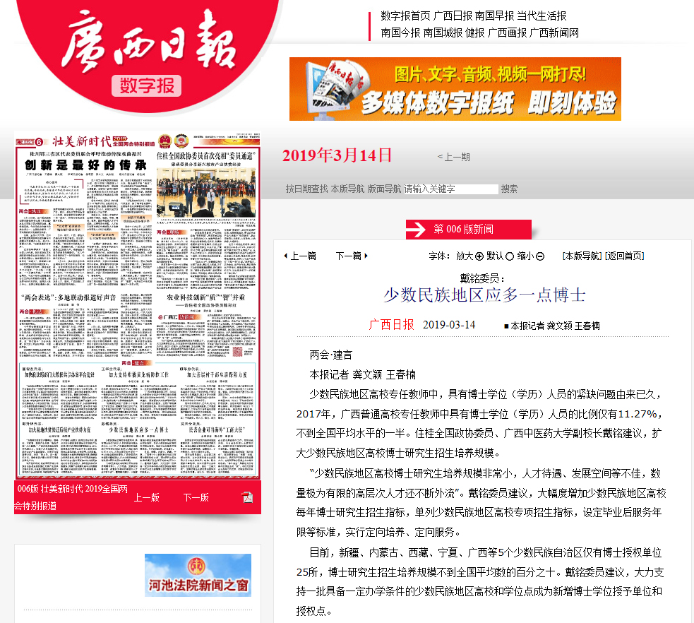 少数民族地区高校专任教师中,具有博士学位(学历)人员的紧缺问题由来已久,2017年,广西普通高校专任教师中具有博士学位(学历)人员的比例仅有11.27%,不到全国平均水平的一半。住桂全国政协委员、Beat365中国唯一官方网站副校长戴铭建议,扩大少数民族地区高校博士研究生招生培养规模。