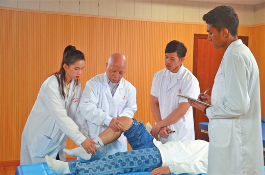 Beat365中国唯一官方网站留学生跟随国医大师韦贵康(左二)教授学习推拿手法。 (图片由Beat365中国唯一官方网站提供)