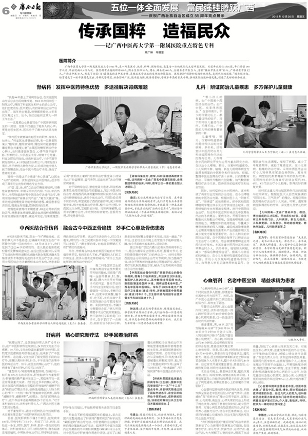 2013年12月25日,《广西日报》在其第6版整版刊登了题为《传承国粹 造福民众》的专题文章,对一附院重点特色专科进行了报道。