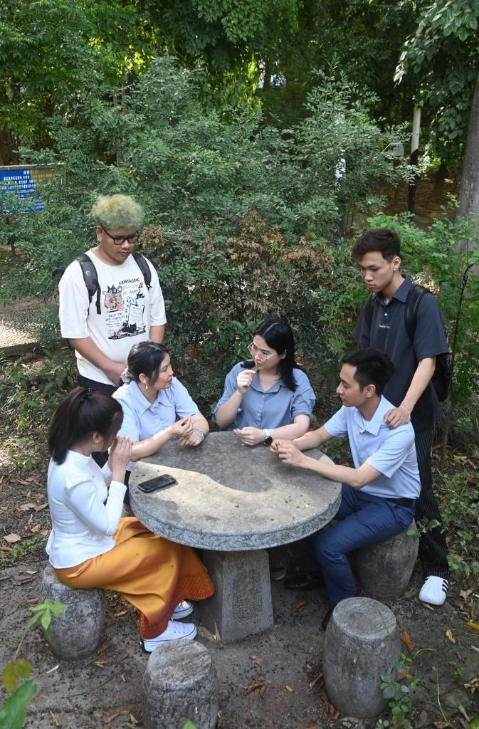 広西中医薬大学で授業の合間に連絡先を交換するタイ人留学生の張明珠(AIRADA SAMRANRUEN)さん(左)とカンボジア人留学生の宋梦玉さん。(4月14日撮影、南寧=新華社記者/陸波岸)