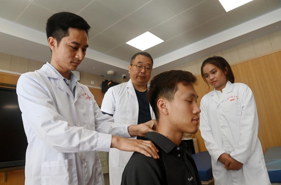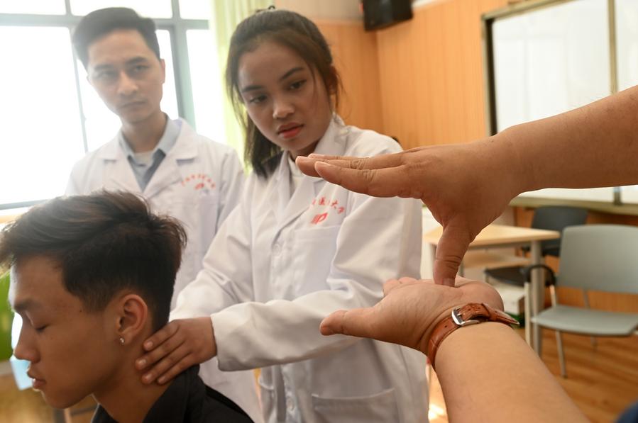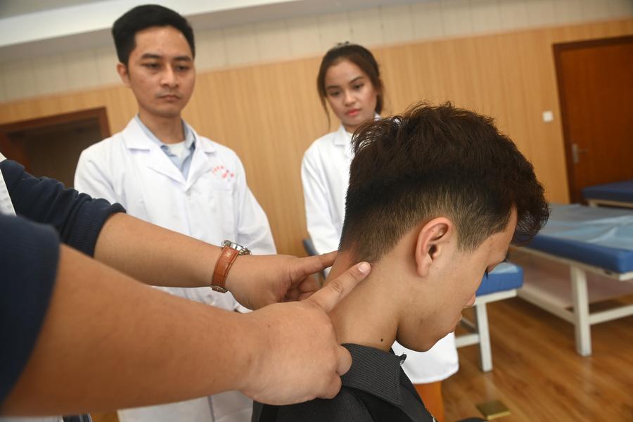 広西中医薬大学で推拿技法を学ぶASEANの留学生。(4月14日撮影、南寧=新華社記者/陸波岸)