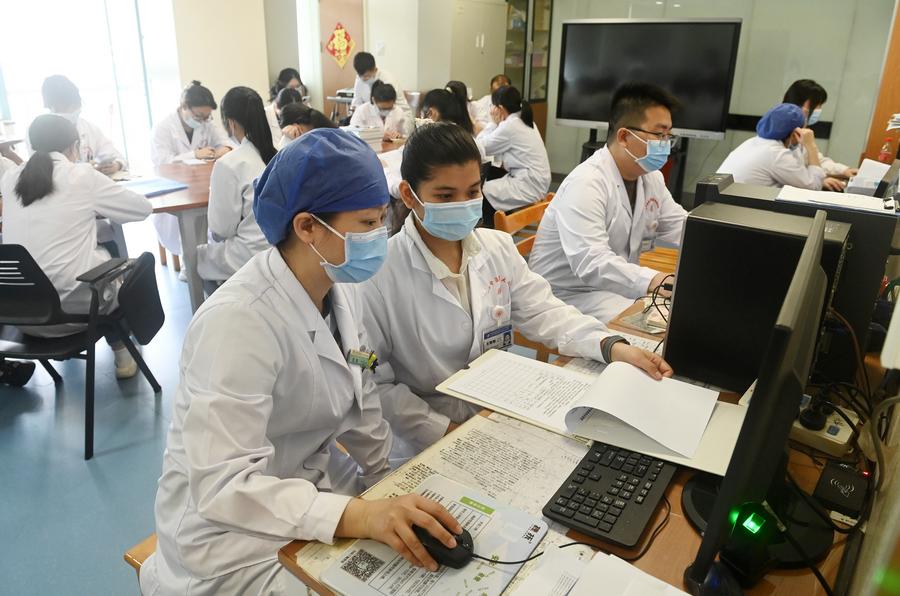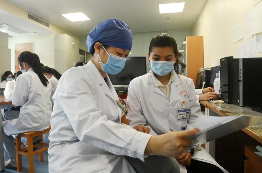 広西中医薬大学付属瑞康医院で研修中のカンボジア人留学生の蘇娜娜(SOUT CHANA)さん(手前左から2人目)に患者の症例記録の確認を指導する楊春(よう・しゅん)先生(手前左から1人目)。(4月15日撮影、南寧=新華社記者/陸波岸)