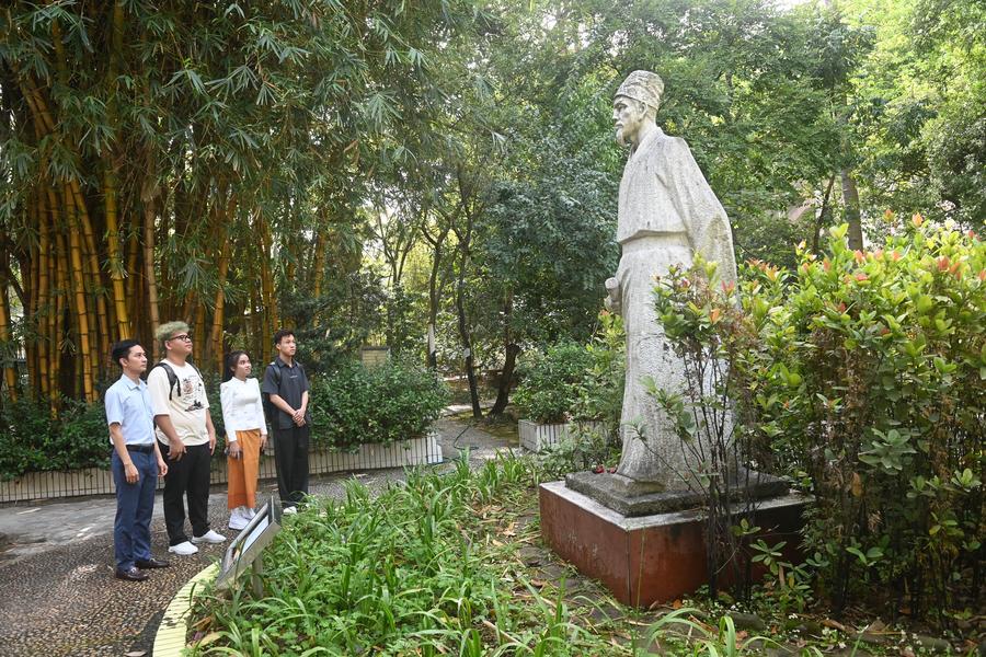 広西中医薬大学の薬用植物園を見学するベトナムとカンボジアの留学生。(4月14日撮影、南寧=新華社記者/陸波岸)