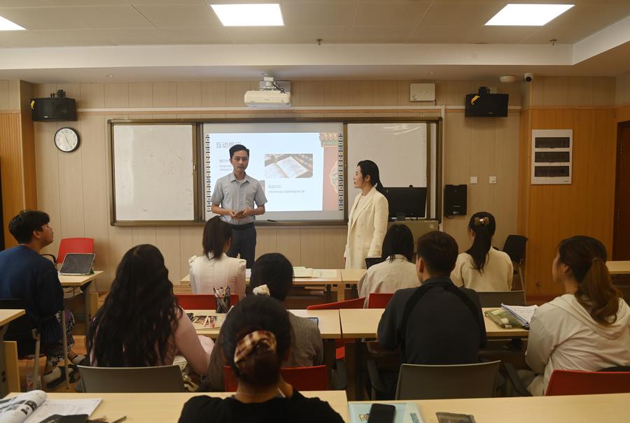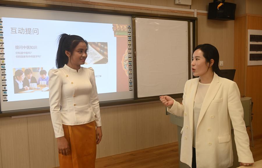 広西中医薬大学の教室で言葉を交わす王源先生(右)とカンボジア人留学生の宋梦玉さん。(4月14日撮影、南寧=新華社記者/陸波岸)