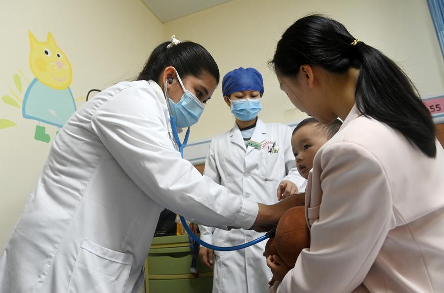 広西中医薬大学付属瑞康医院で患者を診察する研修中のカンボジア人留学生、蘇娜娜さん。(4月15日撮影、南寧=新華社記者/陸波岸)