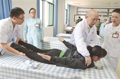 据了解,韦贵康教授从事骨伤科临床医疗、教学工作50余年,是享受国务院特殊津贴专家,世界中医骨科联合会资深主席,世界手法医学联合会主席,广西国际手法医学协会理事长。曾先后任广西中医学院第二附属医院院长、广西中医学院院长、骨伤科研究所所长。韦贵康教授以骨伤手法治疗著称,对颈椎病,颈、腰椎间盘突出症,颈、腰椎管狭窄症,胸椎小关节紊乱症,骨盆倾斜症与脊柱相关疾病,骨伤科疑难杂症等诊疗具有独到经验。据悉,韦贵康教授将不定期来田阳院区为群众诊疗。图为韦贵康教授在给患者实施“飞燕疗法”。