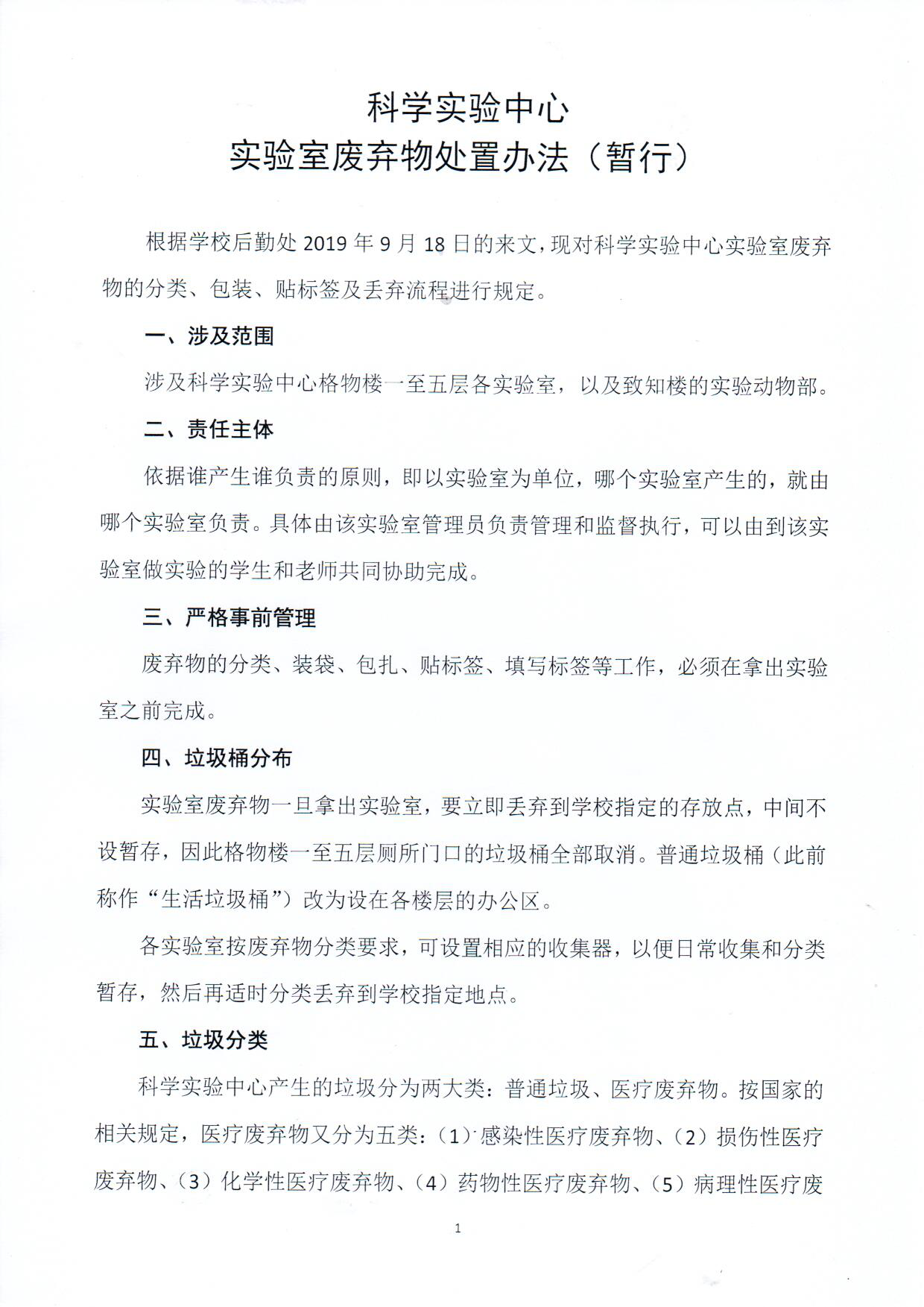 科学实验中心关于施行《实验室废弃物处置办法(暂行)》的通知 来源:科学实验中心 作者:陈柏承 日期:2019-09-30 点击数: 次 分享到: 各有关实验人员:根据学校领导相关工作部署以及后勤处《关于医疗废弃物回收的通知》要求,科学实验中心领导高度重视,立即组织各部门主要技术骨干和负责人,通过反复论证和商讨,初步制定了《科学实验中心实验室废弃物处置办法(暂行)》,对实验室废弃物的分类、包装、贴标签及丢弃流程进行了明确规定,并于2019年10月1日起正式执行。具体办法如下:附件:科学实验中心关于施行《实验室废弃物处置办法(暂行)》的通知 打印正文 关闭本页
