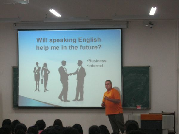 来自美国的外教老师Aaron以轻松愉悦的互动方式与同学展开交流。他就“我们为什么要学好英语”给同学们进行了全面的剖析,并以生动的例子阐述了英语的广泛性和实用性,幽默风趣的讲授方式和全面深入的讲解赢得同学们掌声和欢呼声。