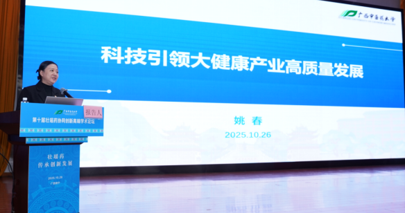 姚春在论坛主会场作了题为《科技引领大健康产业高质量发展》的主旨演讲。她从大健康产业发展的机遇、广西中医药资源情况和大健康产业发展的思考与策略三个方面,系统梳理了大健康产业的时代机遇,介绍了广西在区位生态、康养旅游、药材资源、香精香料及药食同源品种等方面的天然优势,并重点展示了Beat365在人才集聚、科技研发、医疗服务与国际合作等方面形成的核心竞争力,为推动产业发展奠定了坚实的信心基础。姚春提出的一系列策略极具战略价值,规划了以科技引领、涵盖诊疗能力提升、制剂开发、智能化建设、国际化推广及中国—东盟合作的清晰实施路径。整场报告高屋建瓴、内容翔实,兼具理论高度与实践价值,为推动壮瑶医药协同创新与产业高质量发展提供了重要指引。