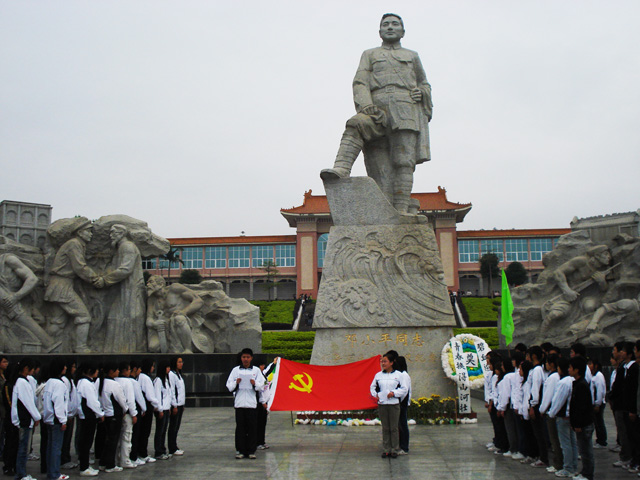 同学们在烈士雕塑像前肃然起敬,主持人宣读祭烈士文,全体同学将自己追寻烈士足迹、忠心报效祖国的铮铮誓言留在了烈士陵园上空。接着,全体同学默哀三分钟,深切怀念烈士。最后,由同学代表向烈士献花,明黄的菊花,寄托着同学们深深的哀思。