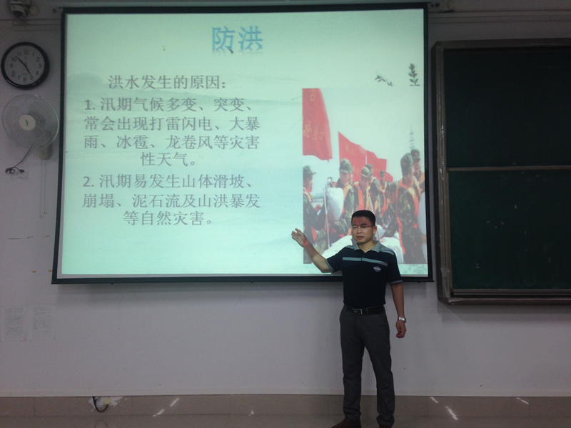 高职院学生科科长黄陆良老师为同学们讲防汛防洪安全知识