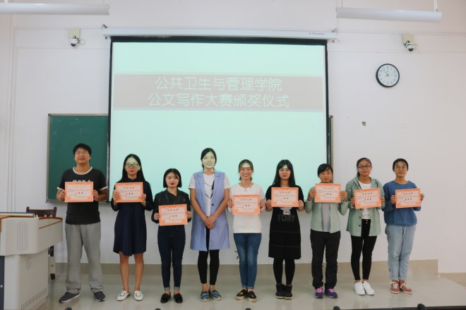 为普及公文写作知识,提高同学们对公文写作重要性的认识,公共卫生与管理学院于2017年10月21日晚19:00在仙葫校区教学楼1-203举办了以“学以致用,妙笔生花”为主题的公文写作知识竞赛,并于2017年10月26日中午11:50在教学楼2-105举行表彰大会,公共卫生与管理学院团委书记鲁蕴律老师出席此次活动,院团委学生会成员及获奖的同学积极参加了本次表彰大会。