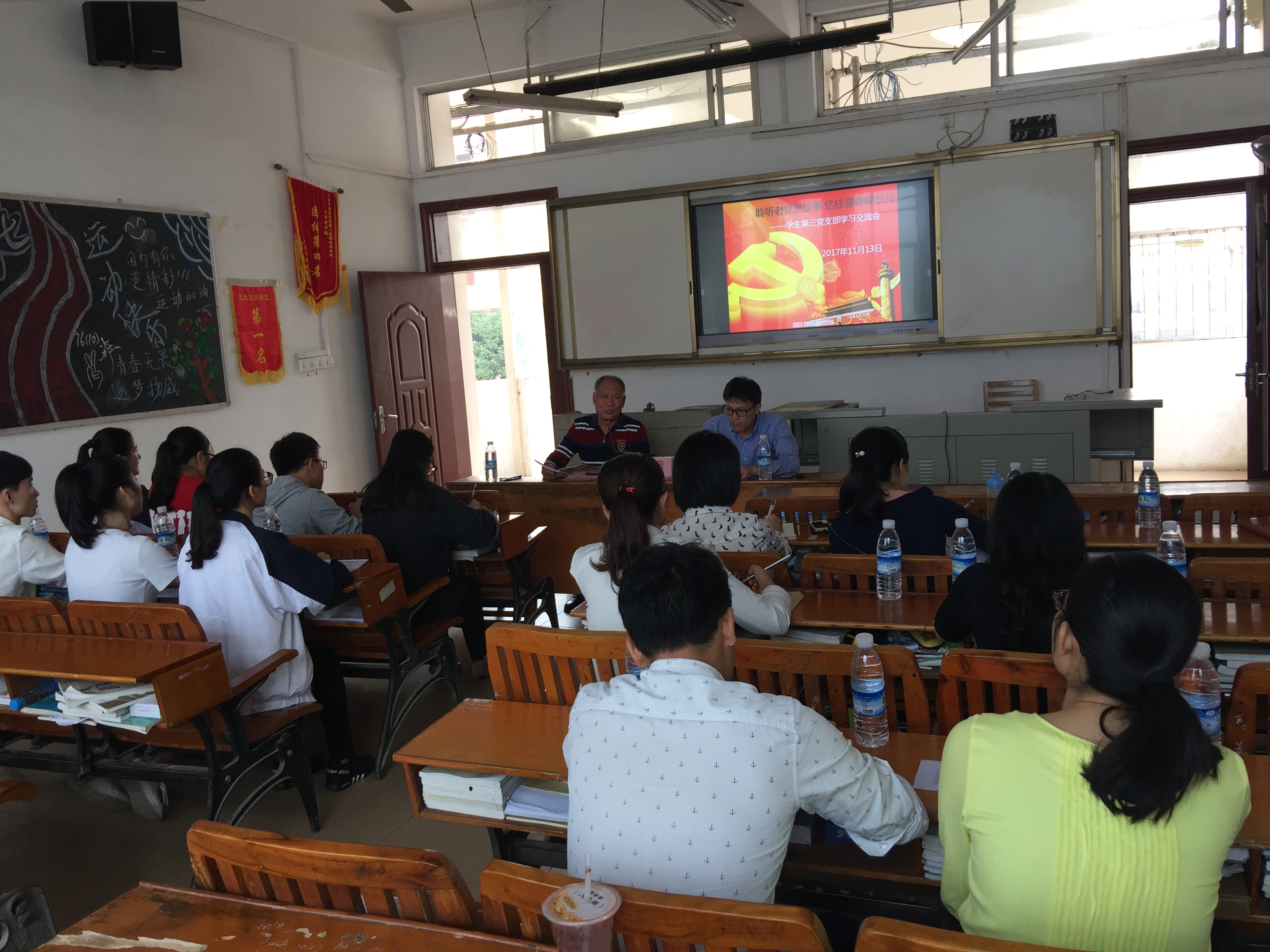 2017年11月13日下午,高职院、附设中医学校党总支学生第三党支部全体党员及入党积极分子在北湖校区1号教学楼201室举行主题为“聆听老党员故事,忆往昔峥嵘岁月”的学习交流会。会议由第三党支部书记黎海祥老师主持,特邀请中越自卫反击战老兵黎彩泉同志作为主讲嘉宾。