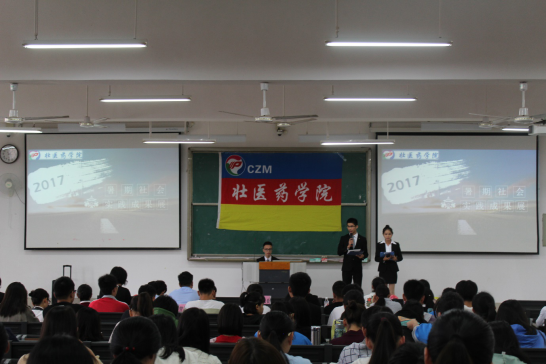 11月14日下午,由壮医药学院团委举办的2017年“青春喜迎十九大,不忘初心跟党走”暑期社会实践成果展示会在1-201教室举行。壮医药学院院长蓝毓营、副院长韦英才、副处级调研员韦杏,学办主任兰天莹、团委书记刘婷等领导及老师出席,实践团队代表以及各团支部的学生干部代表参加本次活动。