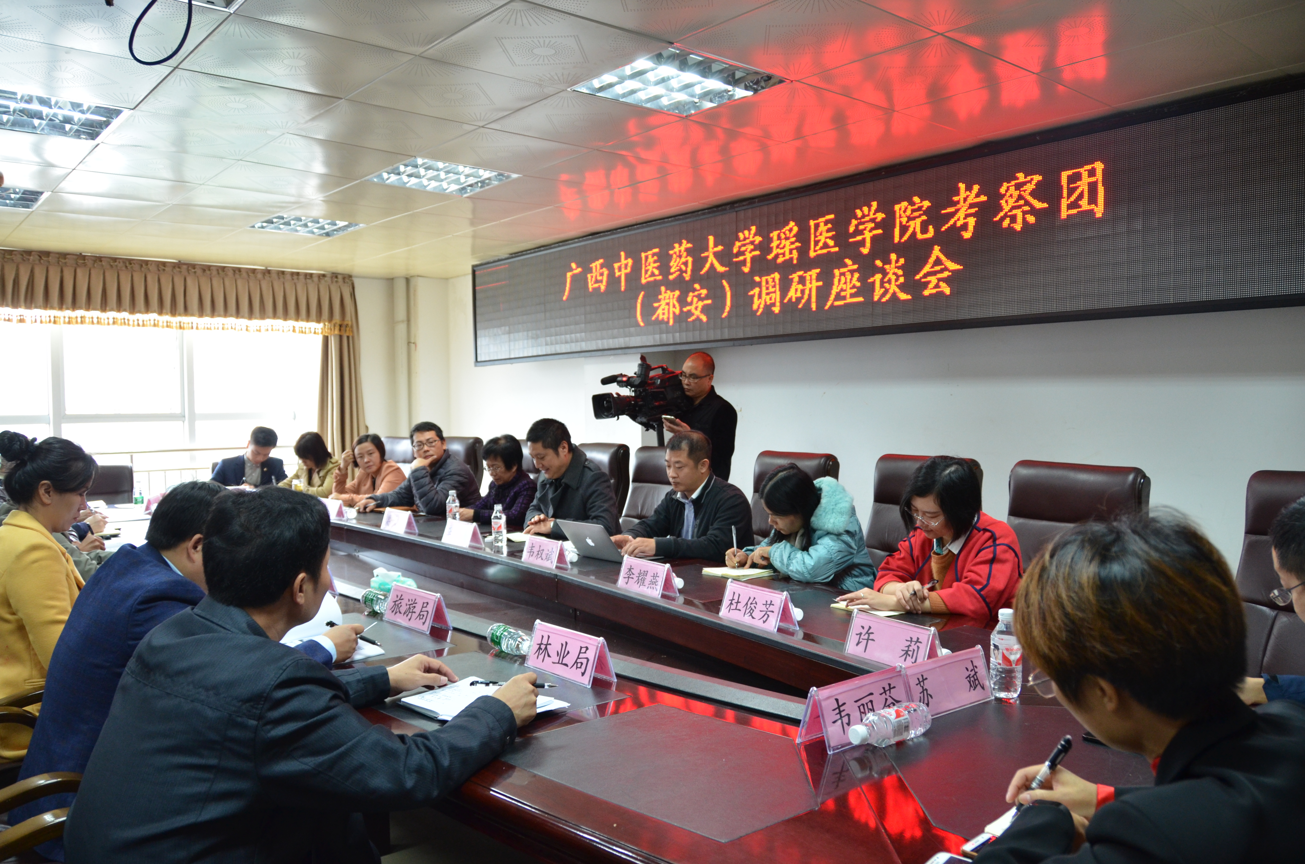 2017年11月19日,Beat365中国唯一官方网站瑶医药学院李彤副院长一行9人到广西都安瑶族自治县开展瑶医药考察调研活动,并参加了都安瑶族自治县瑶医药发展工作座谈会。都安县蓝如帅县长、县政府有关部门领导及上海市广西商会20多人出席座谈会。会议由蓝如帅县长主持。会议核心内容为都安瑶医瑶药文化发展,健康养生产业、旅游业、文化产业三产业并轨,将都安打造成旅游、健康养生的乐园,并对拟规划建设的瑶族小镇献计献策。