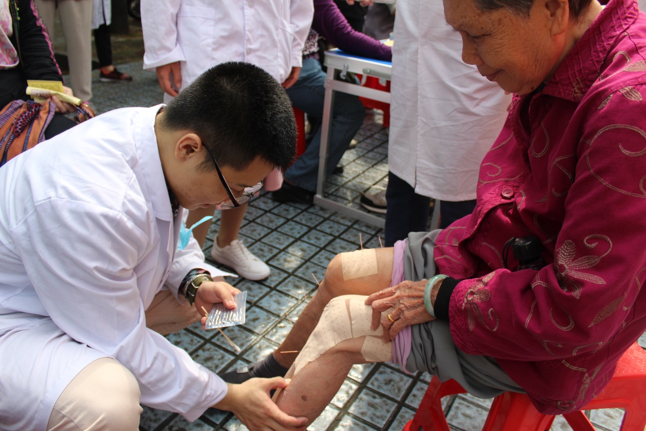 志愿者给社区老人进行针灸