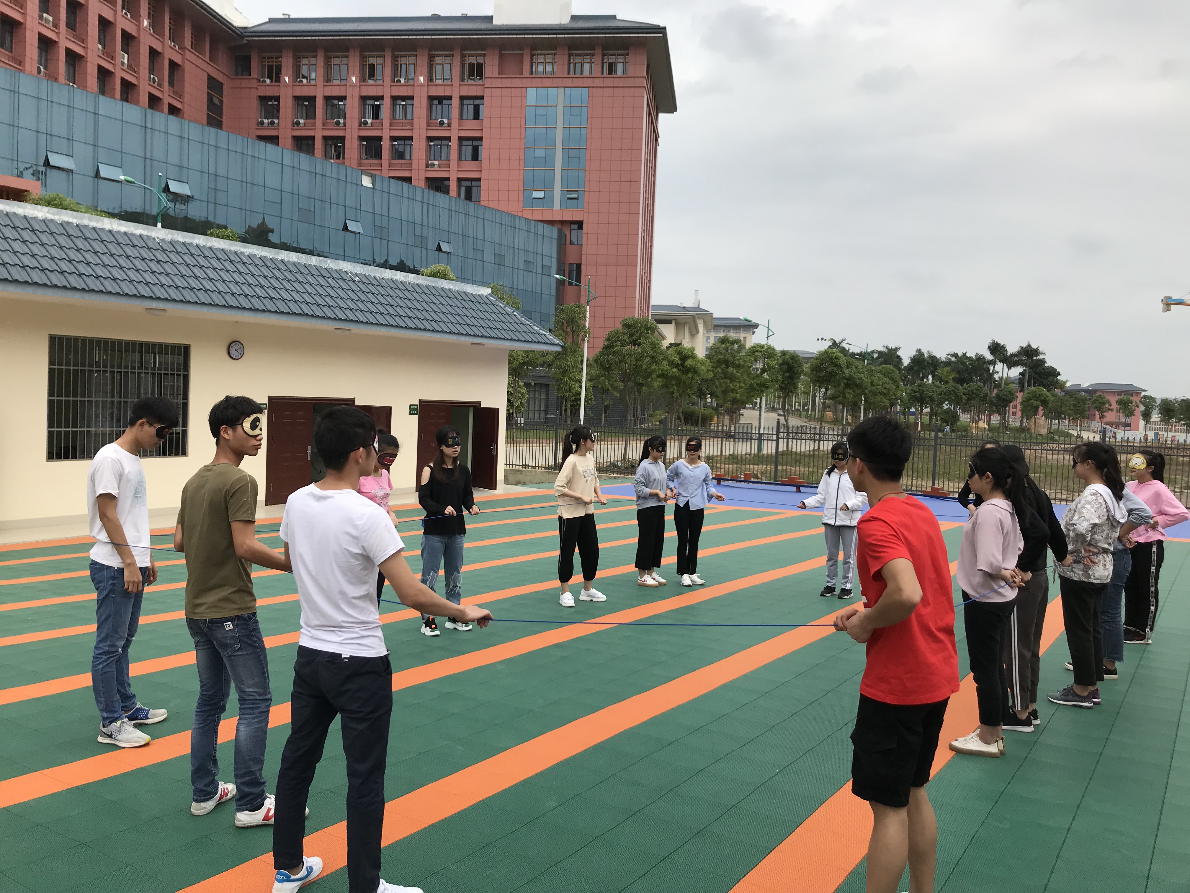本次拓展活动以欢乐体验方式教学为主、理论解说为辅,活动体验与学员分享互相结合。通过开展“传声筒”、“盲人方阵”“鼓动人生”三个集体项目培养团队的沟通技巧、协作能力和意志力。以团队竞技方式进行的“传声筒”培养团队成员的默契配合意识和集体荣誉感,从游戏中体会团队合作重要性;“盲人方阵”则让成员们在拓展活动中切身体验感观剥夺后,如何建立有效沟通、完成团队目标需要什么,从中领会相互沟通与信任、统一指挥以及任何问题的解决都有一个理论为支撑的重要性;多人共同以鼓击球的“鼓动人生”培养成员不怕挫折不断进取,争创佳绩的意识和全体成员取长补短,团结协作完成共同目标的能力。游戏结束后,教练采取经验自评与他评的方式让同学们总结在游戏中表现出的优势、不足与自我思考,教练的总点评结合了日常的学习、生活与工作说明团队团结协作、相互激励和相互信任的重要性,让班干们深受启发。