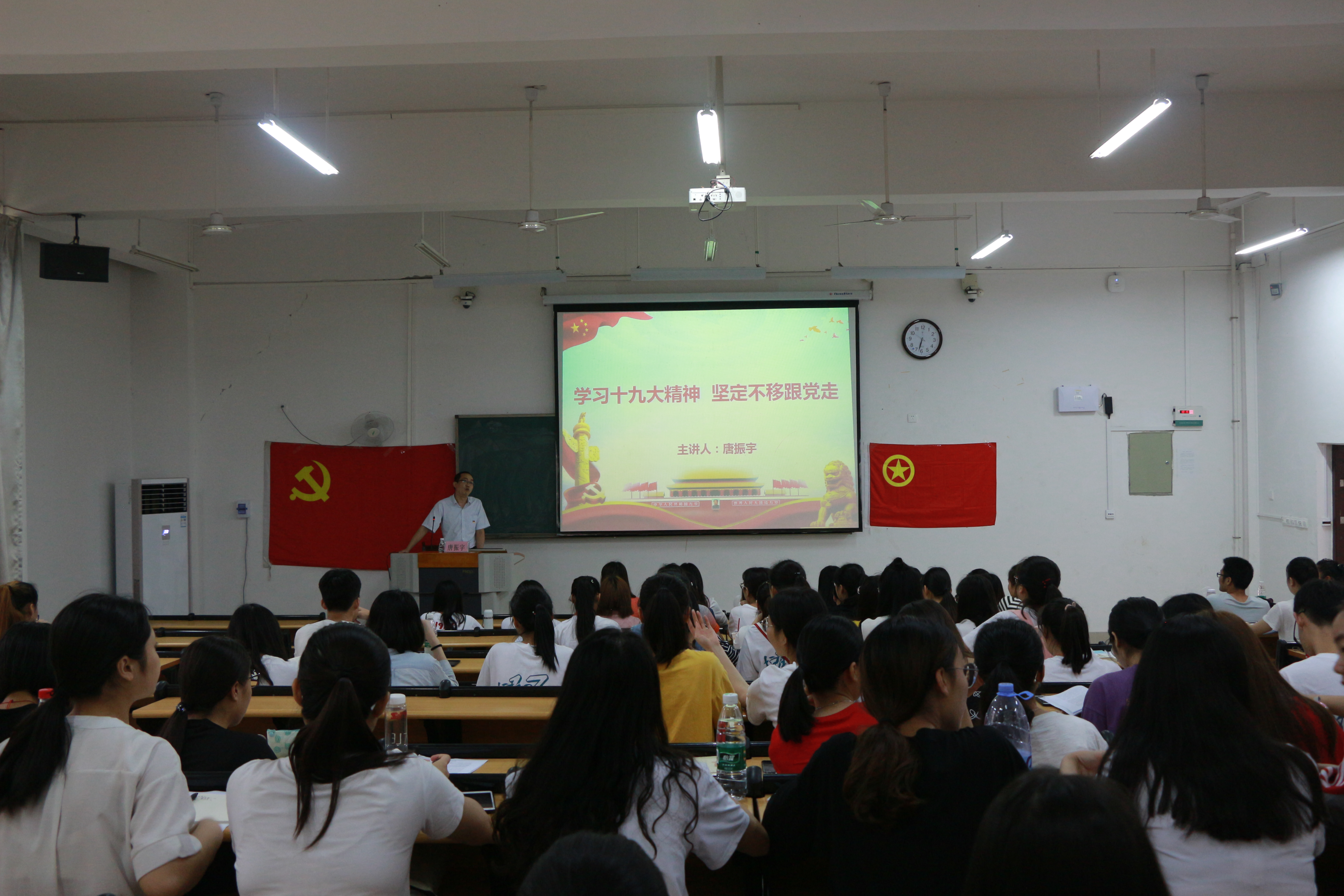 七位老师结合当代中国发展,带领同学们学习党史党情,领会党的精神实质和丰富内涵、共产党员的要求等,如唐振宇结合“十九大以及新党章”内容,强调十九大精神为中国未来的发展指明方向,望青年们牢记时代使命,发挥先锋模范作用。李月发就“廉政”一词引导积极分子树立正确的人生观、价值观,共同为实现共产主义而奋斗。冼锦华带领大家深入学习两会精神,志存高远。吴彬则系统而详实地向入党积极分子讲解了“中国共产党的最终目标和现阶段任务”,增强同学们作为入党积极分子的责任感和使命感,鞭策同学们以实际行动争取早日入党。韩叶芬带领同学们学习党的组织纪律,对同学们提出慎独的要求,以党员标准严格要求自己;胡艳宁通过追忆新中国成长的不易,教育同学们以党的指导思想作为学习与生活的行动指南。马秋平回顾党的光辉历史,号召在座积极分子以老一辈革命者为榜样,不断积累学习,早日加入中国共产党。