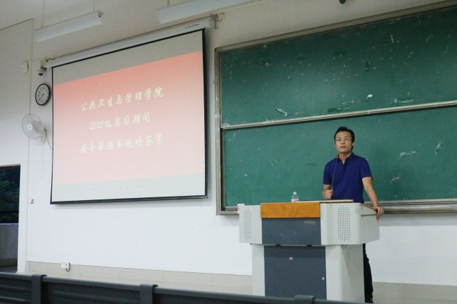 7月8日晚,在仙葫校区教学楼1-201教室,公共卫生与管理学院开展针对2015级全体同学实习前安全承诺书讲解和学生现场签字确认工作。