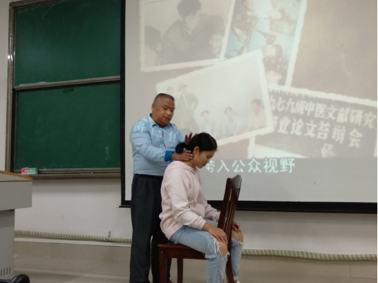 覃定学以壮医药文化发展历史与现状入手,向同学们介绍了自己学习壮医药的历程和运用壮医药服务于社会。并与在场的同学分享了他丰富的临床经验,展示了壮医经筋疗法。