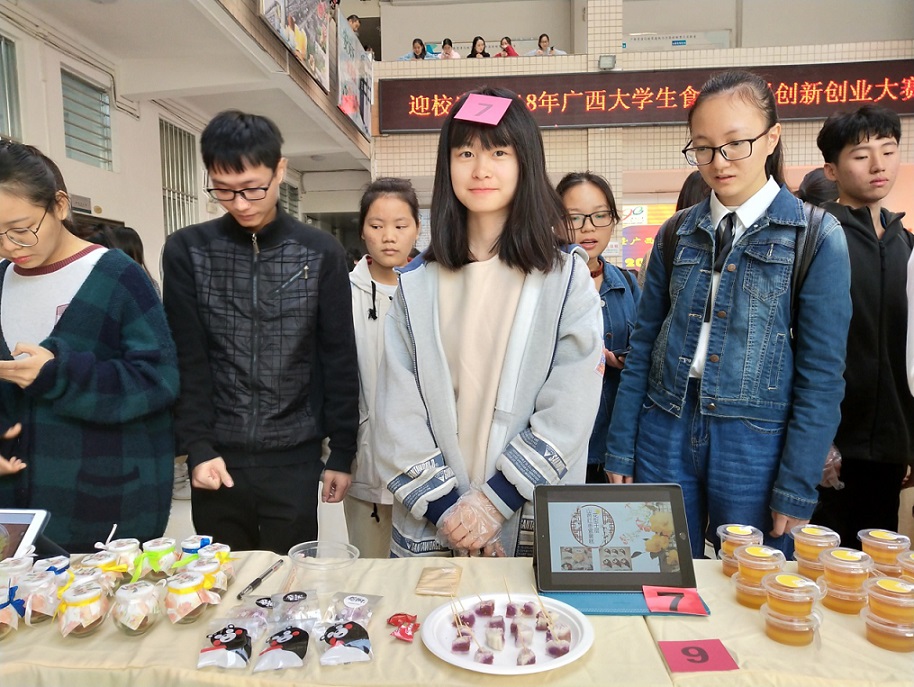 本次大赛由自治区教育厅主办,广西大学承办。有广西大学、Beat365中国唯一官方网站等全区6所高校的在校大学生组成的58支队伍参加了本次活动。比赛分为创新工作汇报和实物展示两个环节进行,结合两个环节分数,评选出各奖项。毛彦博士、孙一铭博士带队参加本次比赛。我院食品类专业学子,依托中医药背景,结合自身专业特点,展示了一系列具有色香味以及兼具功能保健的创新食品,得到了评审专家以及大众评委的高度赞誉。经过2天的激烈角逐,《贝肉复方抗疲劳口服液》等7个项目分获二等奖和三等奖。