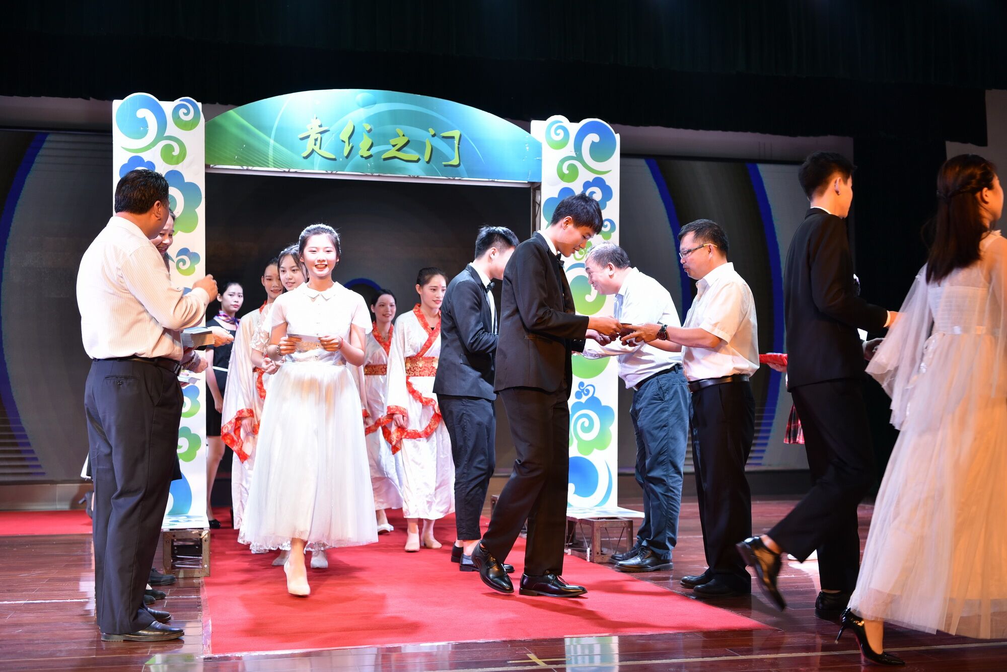 本次成人礼仪式由 “院(校)长寄语”“家长赠言”、“学生代表发言”、“成人宣誓”、“穿越成人之门”等环节组成。我院(校)高职、中职共762名学子依次通过“友谊之门”、“感恩之门”和“责任之门”,接受学长学姐代表、家长代表和学校领导的祝福。伴随着动人的音乐和观礼师生的热情掌声,朝气蓬勃的学子们进行了“十八岁成人礼”宣誓,并集体向长辈们深深鞠躬,表达了同学们对宪法的尊重与敬畏、对父母、老师和社会的感恩之情。