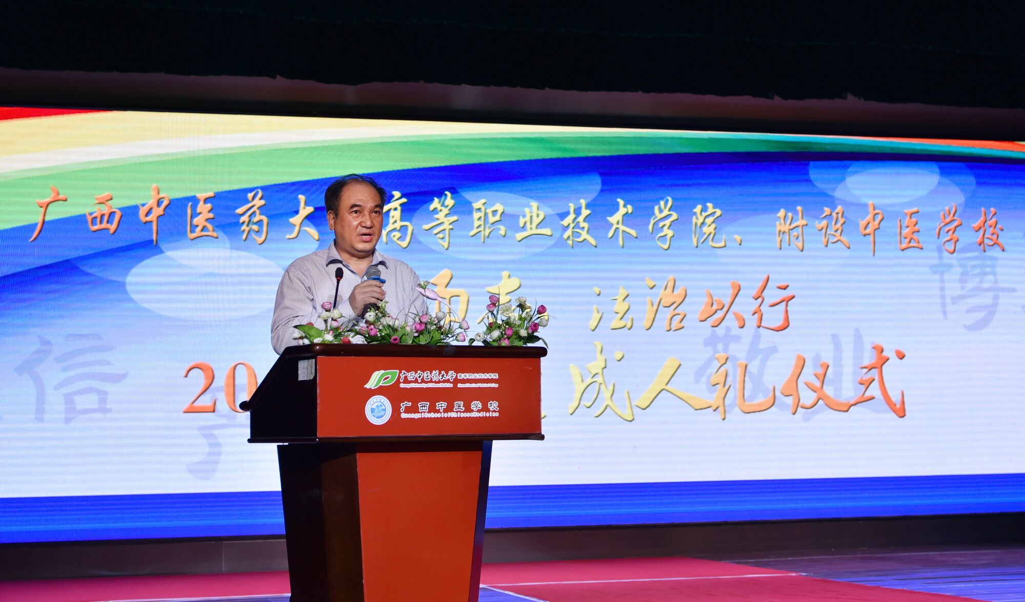 12月4日国家宪法日当天,Beat365中国唯一官方网站高等职业技术学院、附设中医学校在北湖校区礼堂举行以“十八而志,法治以行”为主题的学生成人礼仪式。学院(校)领导、教师代表和家长代表共同见证了同学们的这一神圣庄严的时刻。
