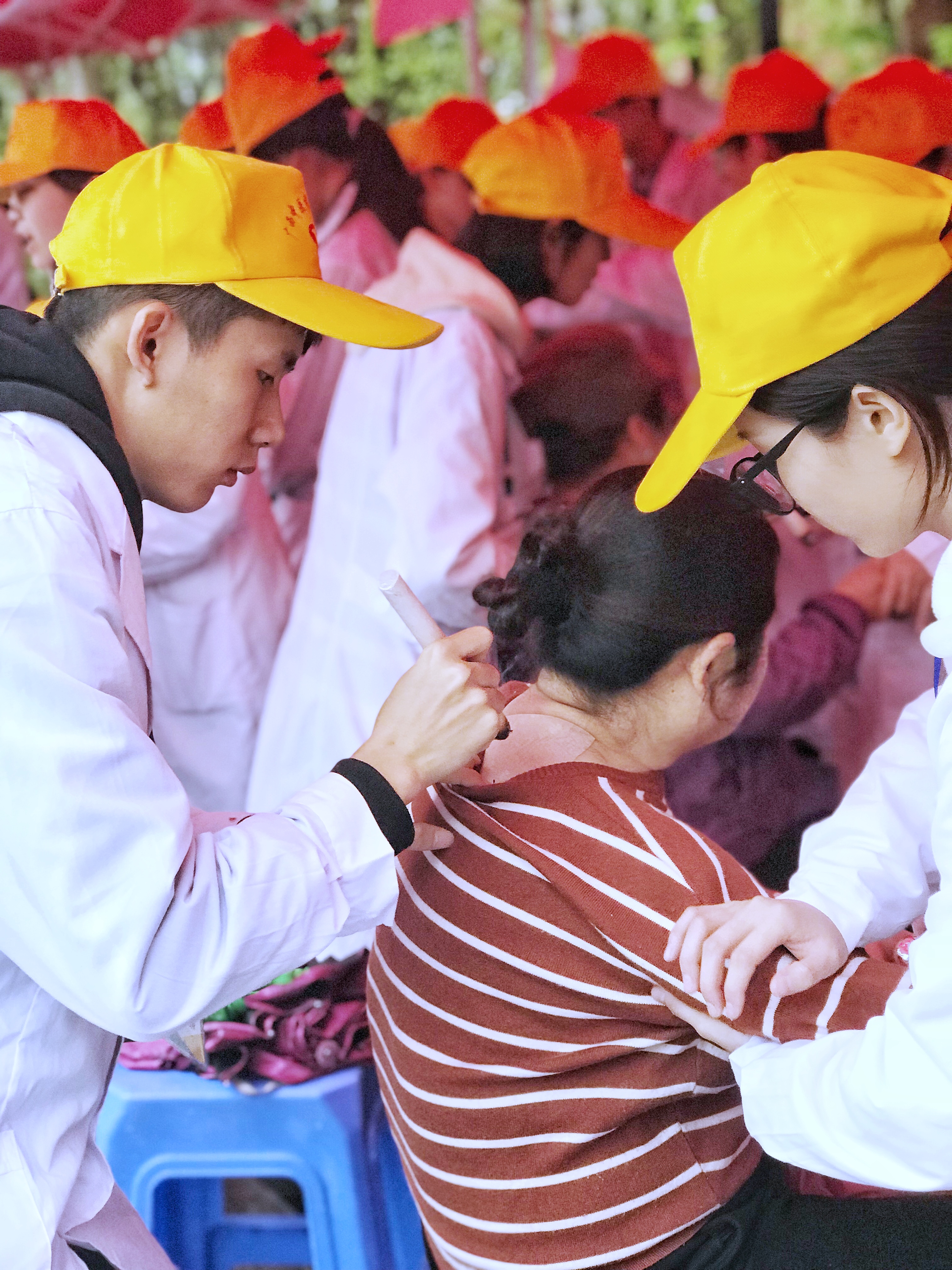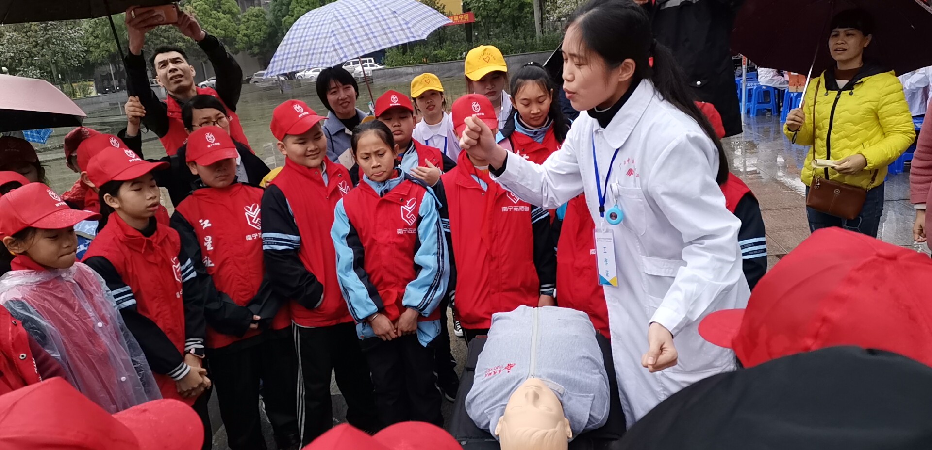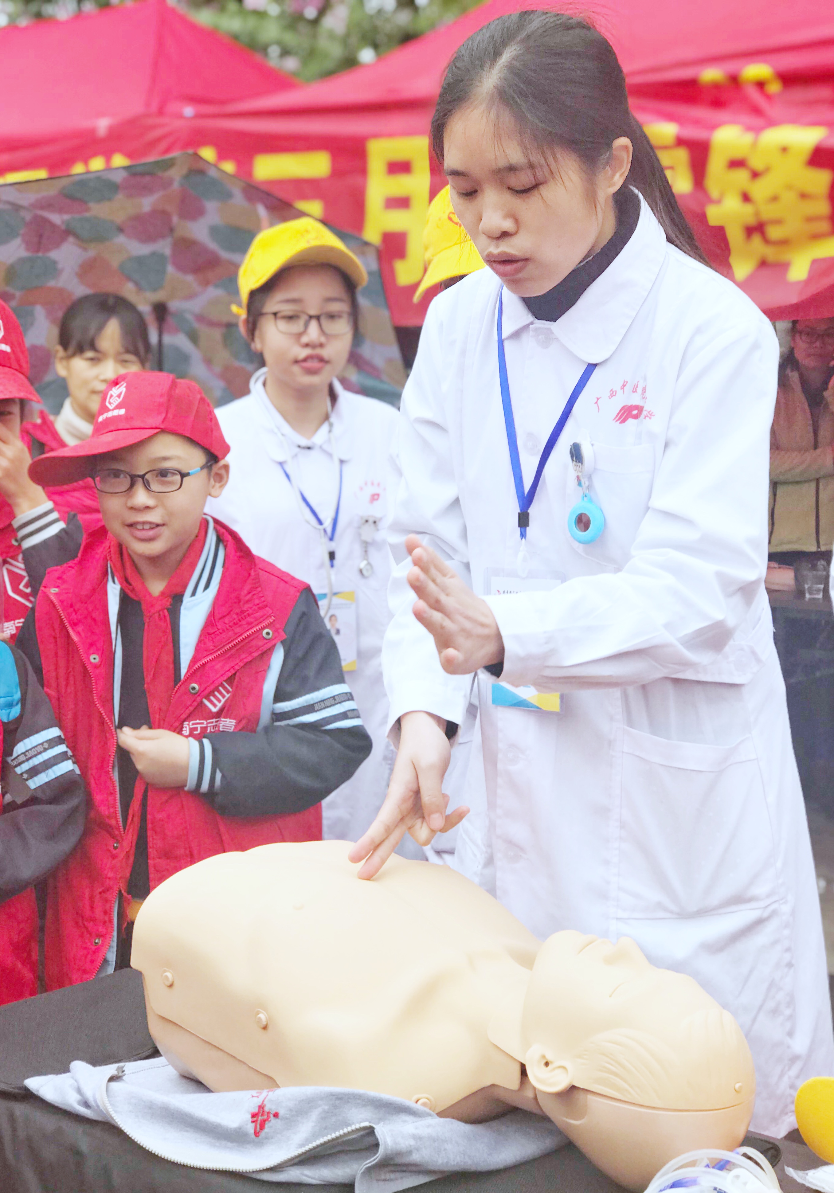 本次义诊活动以健康咨询、健康教育、护理实践操作等的形式开展,分设教育组、推拿组、艾灸组、量血压组以及由学院教师组成的咨询组专业团队。老师们亲切地为前来咨询健康问题的社区居民解答并提出了专业的建议,教育组成员则针对常见慢性病如流行性感冒、过敏性哮喘等进行讲解。而其他成员则通过手法按摩、艾灸等方式为社区广大居民提供保健服务。活动期间,教育组除了为前来咨询的社区居民宣讲外,还为共同来新兴广场开展志愿服务的小学生进行“心肺复苏”技能培训,宣讲相关的急救知识。教师、同学们饱满的热情、娴熟的手法及扎实的医学知识得到了广大社区居民的一致好评。