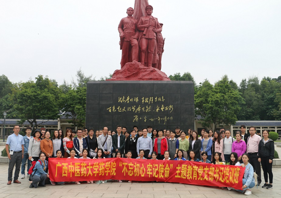 药学院党委为扎实推进“不忘初心、牢记使命”主题教育深入开展, 10月27日上午,药学院党委组织党支部书记、支委前往南湖公园李明瑞、韦拔群烈士纪念馆开展“不忘初心、牢记使命”主题教育轮训班现场教学活动。广西区委党校洪明星副教授担任本次现场教育活动授课老师。本次课程安排是药学院党支部书记主题教育轮训班的教学内容之一。