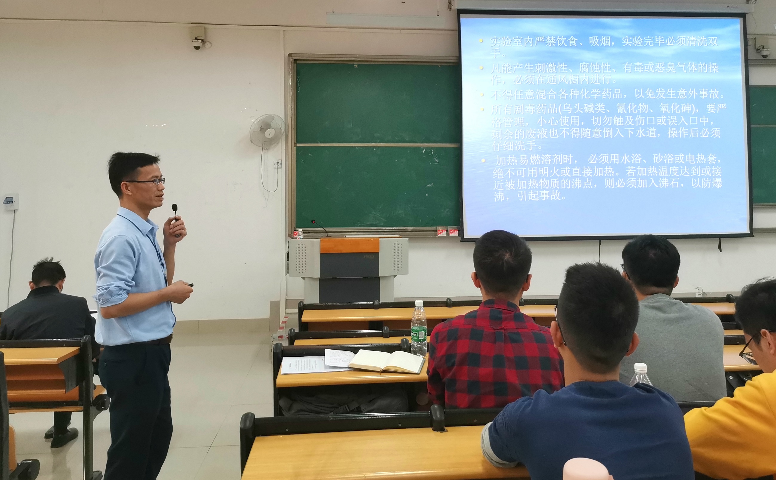 培训中,老师们结合药学院专业特点,着重强调生产安全和实验室安全。授课中从安全生产基础知识、实验室安全事故分析入手,生动细致对毕业生强调安全知识,并提出具体的要求:第一,同学们要通过学习安全生产意义、基本原则、安全生产责任制、法律法规等,让同学们更加深刻地认识到安全生产的重要性;第二,同学们要在生产车间、仓库、实验室等场所必须按照操作规程进行作业,做好个人安全防护措施,抓好安全生产工作,防止安全事故的发生;第三,同学们要通过安全事故案例分析,教育大家防患于未然,提高预防事故的意识和能力。广大同学认真听、认真看、认真记,收到了实实在在的效果。