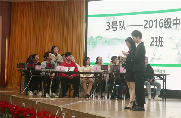 11月30日下午,第一临床医学院2019年临床能力理论知识竞赛在一附院住院综合楼五楼多功能学术厅举行。第一临床医学院党委副书记、副院长钟远鸣,基础医学院中诊教研室主任祝美珍教授,基础医学院方剂教研室秘书孔鹏云老师,基础医学院中医内经教研室刘磊老师,第一临床医学院教学部主任黄彬、学生管理科主任罗之瑜,各班辅导员及学院2016、2017级中医学专业共9个参赛队参与了此次比赛。