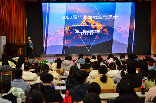 12月22日下午,第一临床医学院在仙葫校区大学生活动中心A座小礼堂顺利召开2020届毕业生就业动员大会。学校招生就业处副处长辛华、第一临床医学院党委副书记、副院长钟远鸣、教学党总支书记罗之瑜、各班辅导员及2020届毕业生共计317人参加本次动员会,动员会由罗之瑜主持。
